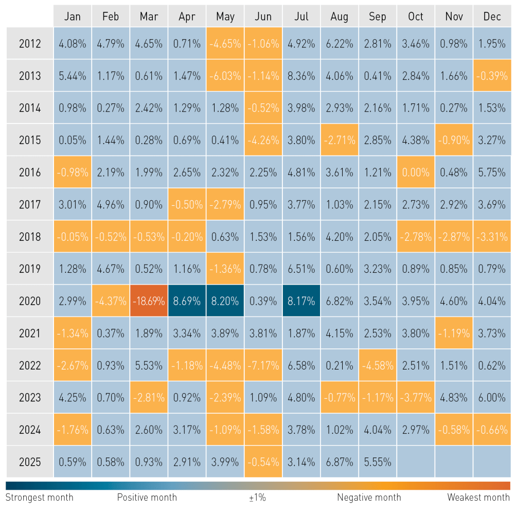 The heat map shows the historic volatility of the Fund. CFM believes that it is important for investors to be aware of this to ensure their risk appetite isn’t compromised through their choice of investment. Past volatility is not an indication of future volatility.
