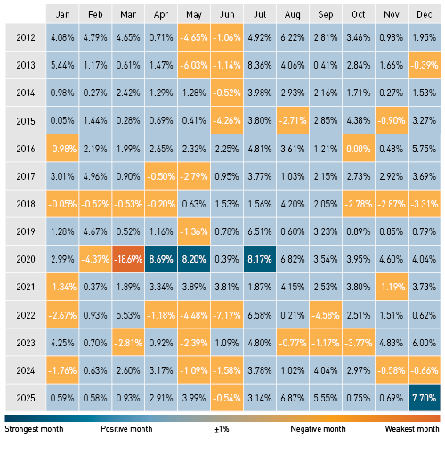 The heat map shows the historic volatility of the Fund. CFM believes that it is important for investors to be aware of this to ensure their risk appetite isn’t compromised through their choice of investment. Past volatility is not an indication of future volatility.