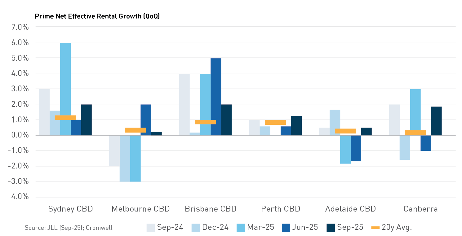 Despite the positive demand result, the national CBD vacancy rate edged +0.1% higher to 15.1% due to weakening conditions in lower quality stock. Sydney was the only CBD market to record a decrease in vacancy rate, underpinned by the absence of development completions over the quarter. Four projects were brought to market in Melbourne CBD and pushed the vacancy rate up +0.4%, however it remains below the peak seen in December 2024. Adelaide saw the largest increase in vacancy as 50 Franklin St reached completion with space still unleased.
